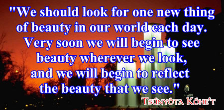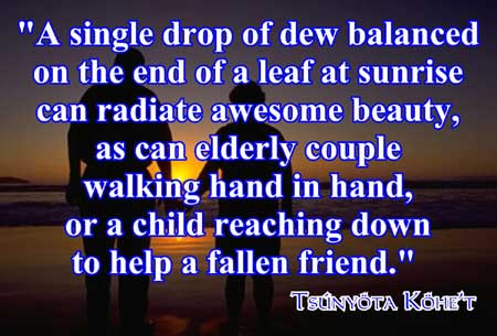 | Beauty is individual and often based on simplicity. A single drop of dew balanced on the end of a leaf at sunrise can radiate awesome beauty, as can elderly couple walking hand in hand, or a child reaching down to help a fallen friend. I could go on and on. | |