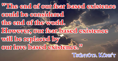 | To experience pure love, and subsequently return to that from which we came, which is pure love, is what motivates our existence, what drives us to experience, and what is the reason for our being. We will all experience pure love, because to experience pure love is the reason why we have been created. As each of us choose to experience pure love, to become who we are, and to experience a love based existence, the basis of the earth plane itself will move form a fear based existence to a love based existence. There will be no second coming heralding the end of the world. What has been determined to be the second coming is simply a completion of what was started. The only way that the world will end is that the fear based existence will end, and a love based existence will begin. We will choose to live within a love based environment during this next millennium, and the number of souls who chose to live within the love based environment will increase, until we reach a point were most souls live within a love based existence. Effectively and collectively heaven on earth will be created, not for a chosen few, but for all who choose. |