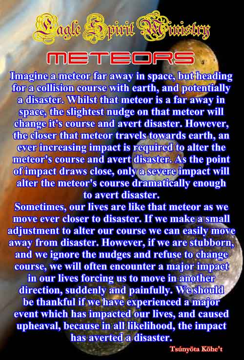 Sometimes, our lives are like that meteor as we move ever closer to disaster. If we make a small adjustment to alter our course we can easily move away from disaster. However, if we are stubborn, and we ignore the nudges and refuse to change course, we will often encounter a major impact in our lives forcing us to move in another direction, suddenly and painfully.