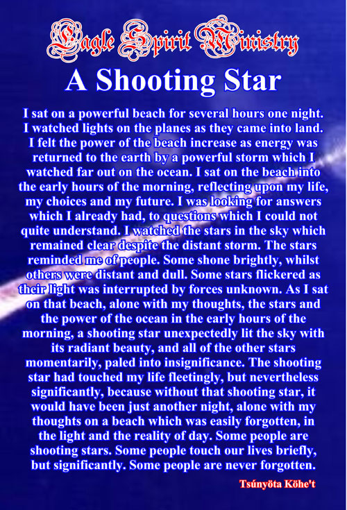 As I sat on that beach, alone with my thoughts, the stars and the power of the ocean in the early hours of the morning, a shooting star unexpectedly lit the sky with its radiant beauty, and all of the other stars momentarily, paled into insignificance. The shooting star had touched my life fleetingly, but nevertheless significantly, because without that shooting star, it would have been just another night, alone with my thoughts on a beach which was easily forgotten, in the light and the reality of day. |