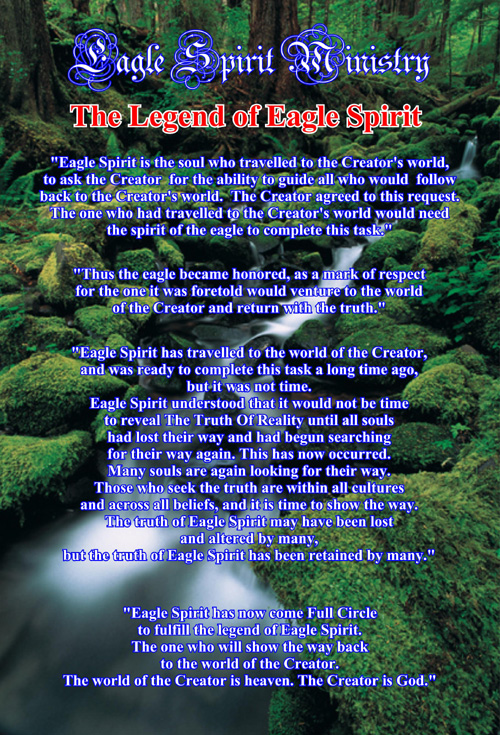 Eagle Spirit has now come Full Circle to fulfil the legend of Eagle Spirit. The one who will show the way back to the world of the Creator. The world of the Creator is heaven. The Creator is God.