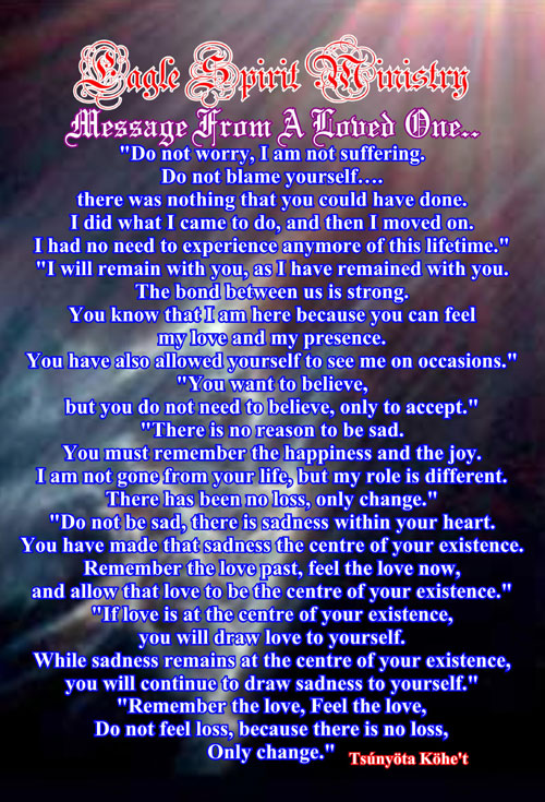 "Do not worry, I am not suffering. Do not blame yourself there was nothing that you could have done. I did what I came to do, and then I moved on. I had no need to experience anymore of this lifetime." "I will remain with you, as I have remained with you. The bond between us is strong. You know that I am here because you can feel my love and my presence. You have also allowed yourself to see me on occasions." |